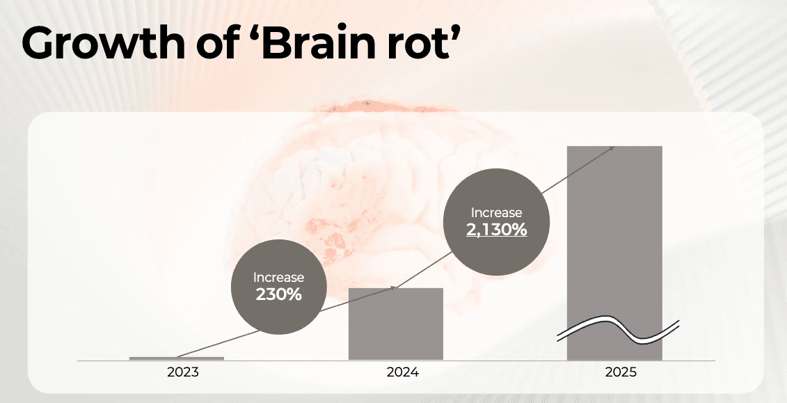 This structural imbalance has led to a phenomenon called "AI Slop." Low-quality, mass-produced content is spreading faster than management and oversight can keep up. Over the past two years, mentions of ‘brain rot’ have surged more than 60x, reflecting rising concern about low-quality AI content. This trend reflects growing public anxiety