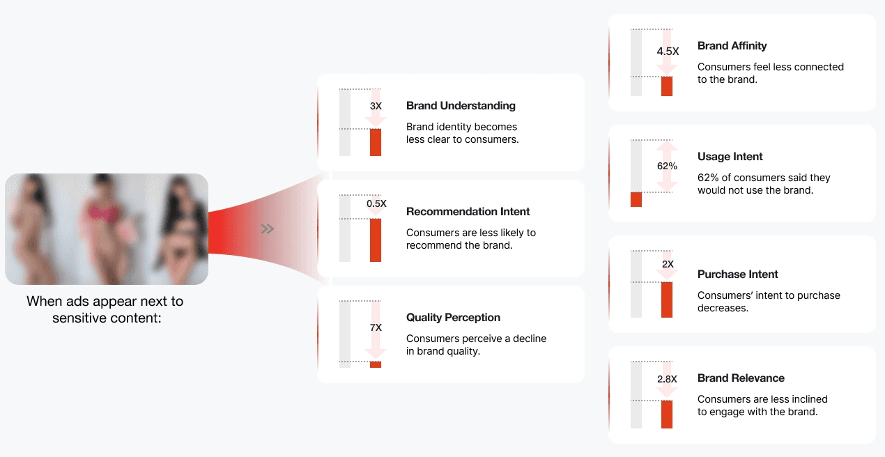 Research makes this risk clear. When ads appear next to sensitive content, perceived brand quality drops sharply—by roughly 7x. Brand affinity falls by 4.5x, and purchase intent is cut in half.