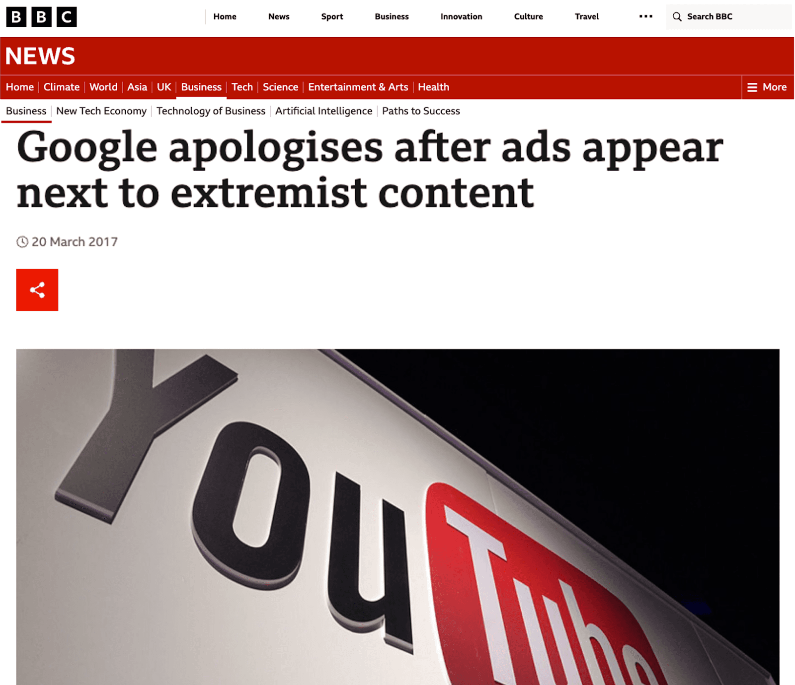 In 2017, ads from major global consumer brands appeared alongside extremist videos on YouTube. Following this, Google introduced policies like "Limited Monetization" (the Yellow Icon) to better manage the ecosystem. (Source: BBC)