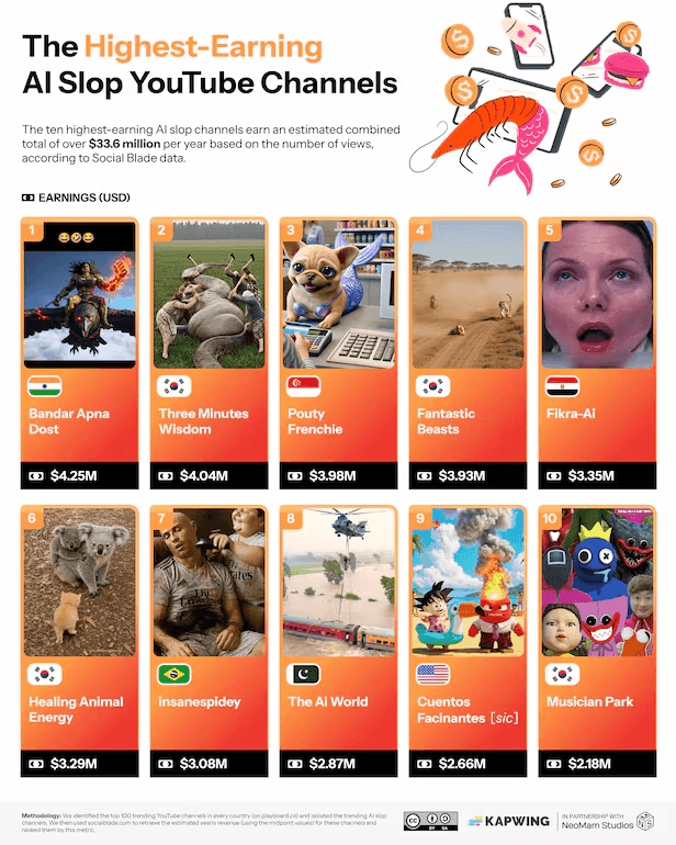Video editing platform Kapwing analyzed the top 10 "AI Slop" YouTube channels by revenue. These channels generate millions of dollars in ad revenue, demonstrating the massive scale of mechanically produced content today.